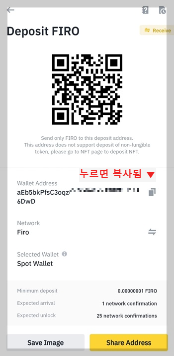 우선 가입 전에 바이낸스에 로그인 이후에 지갑에서 파이(FIRO)로 코인을 검색하시고 "메인넷을 FIRO"로 선택하신 이후에 입금주소를 복사해 주시해 놓으시면 됩니다. ▼ 아래 사진 참조 ▼
