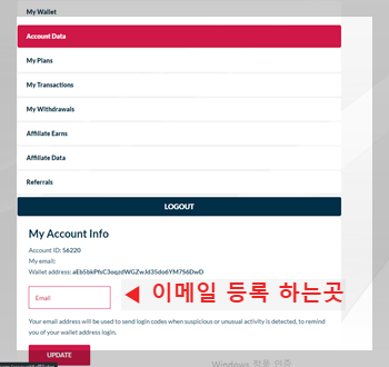 두 번째 로그인하신 이후에는 마이 어카운트에 들어가셔서 하단에 보시면 이메일 정보가 있습니다. 이걸 업데이트해 주셔야 됩니다. 이메일 정보를 넣고 업데이트만 눌러주시면 바로 채굴이 됩니다